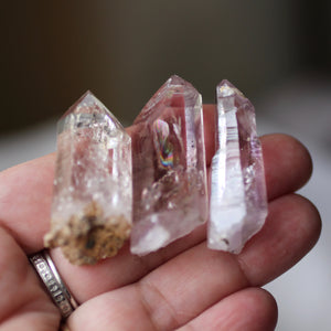 These gorgeous Brandberg Amethyst Crystals sparkle with the brilliance of clear water. Some are more brilliant than others. Some have more violet tones than others. They are mostly single points but there are a couple of clusters. They all have the water energy. Brandberg Amethyst crystals also seem to have many beings present. They are a bridge for beings of other realms to show themselves. I think it’s the water energy that opens up reflections and portals for them to show themselves.